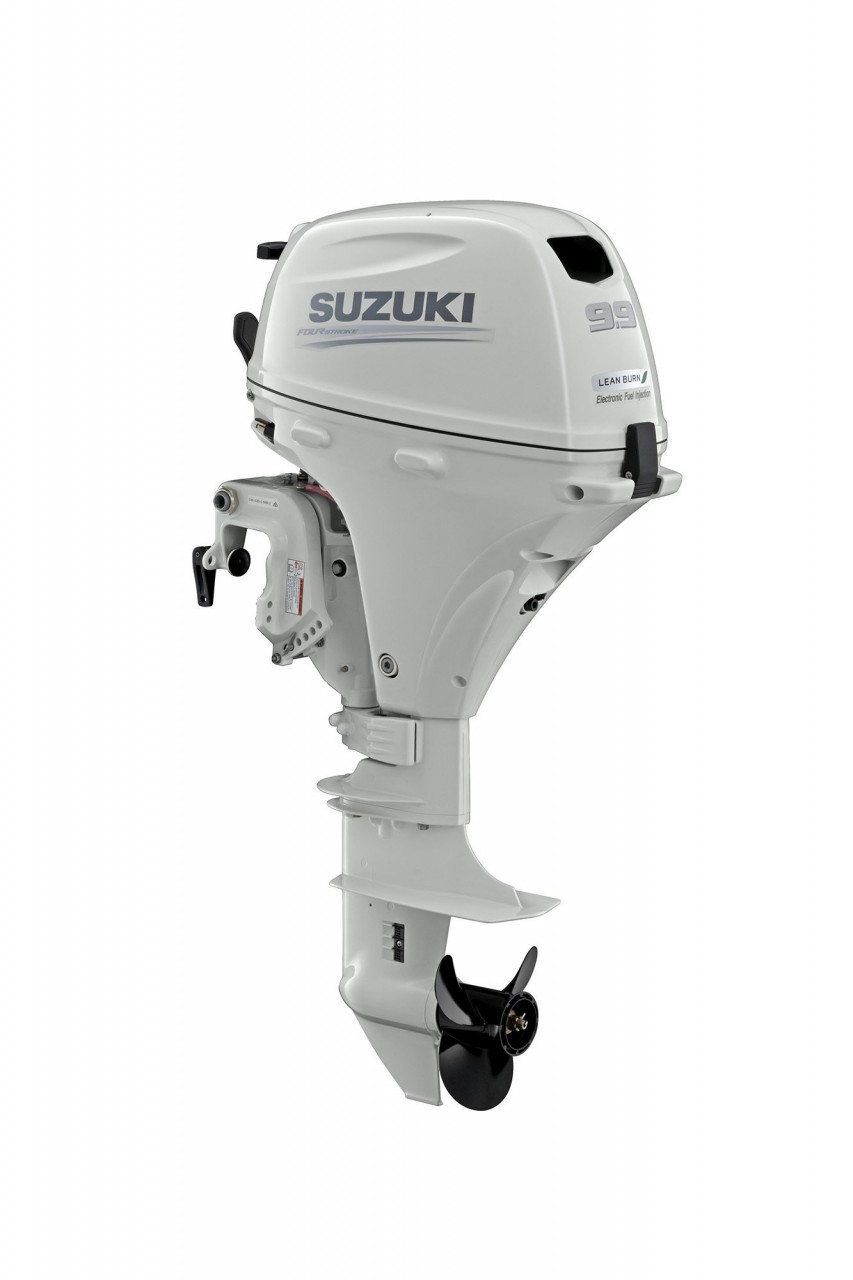 Loading... Please wait...The Suzuki 9.9 hp EFI outboard motor model DF9.9BTLW2 comes standard with 20 inch long shaft, electric start, power tilt and remote throttle and shift control. The 9.9 HP Suzuki outboard motor is an excellent choice of power for medium to larger sized jon boats and skiffs requiring a long shaft as well as auxiliary power for sailboats and trolling/kicker applications. At 120 lbs, this model features push-button electric start with a built-in 12V charging system. In addition, all portable Suzuki models 20 hp and below that feature electric start also retain the thru-cowl manual start pull cord. The 9.9hp Suzuki outboard engine is a great example of Suzuki's continued excellence in engineering with remote steering. Check out the long list of standard features below which make the 9.9 hp EFI Suzuki an exceptional value and industry leader. We offer the Suzuki 3-year warranty as well as free shipping and discounted prices.